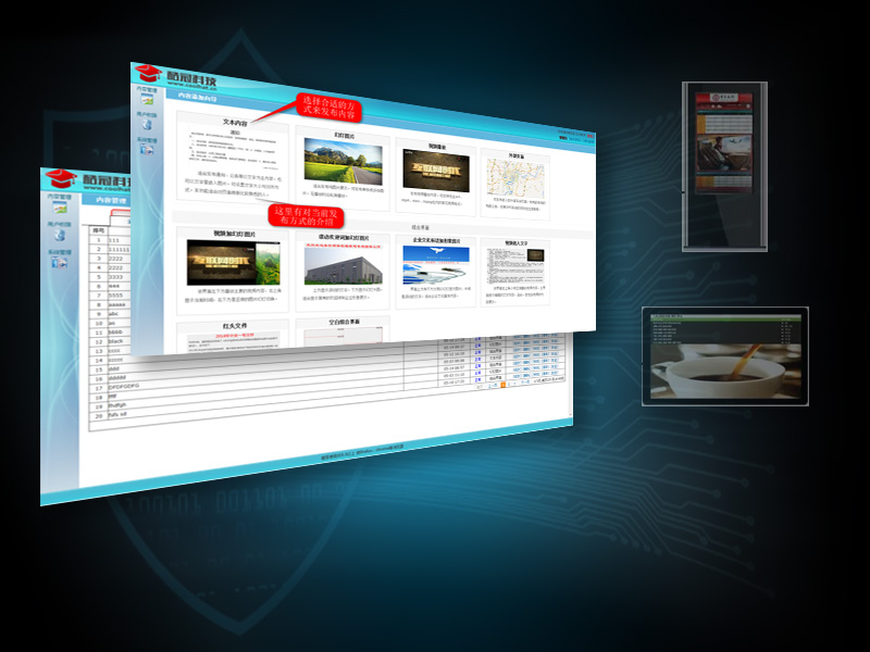 適用于樓宇或展廳的信息管理和發布,支持Android和Windows終端設備。支持文字、圖片、視頻等內容發布,支持預約、定時、空閑任務發布。支持對終端狀態監控和查看。支持定時關機、重啟控制等功能。